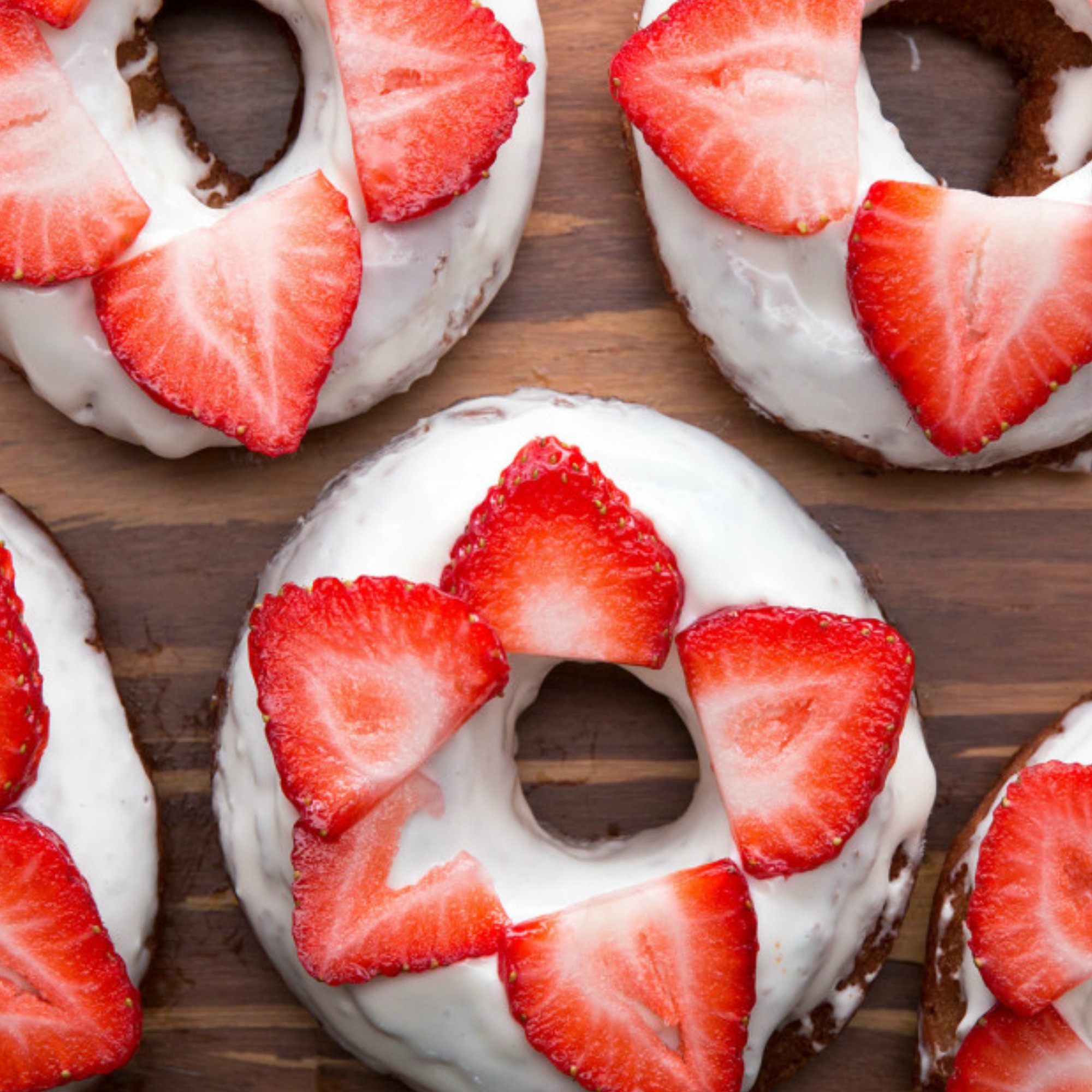 14. Dunk the tops of the donuts in the frosting and garnish with slices of fresh strawberries.